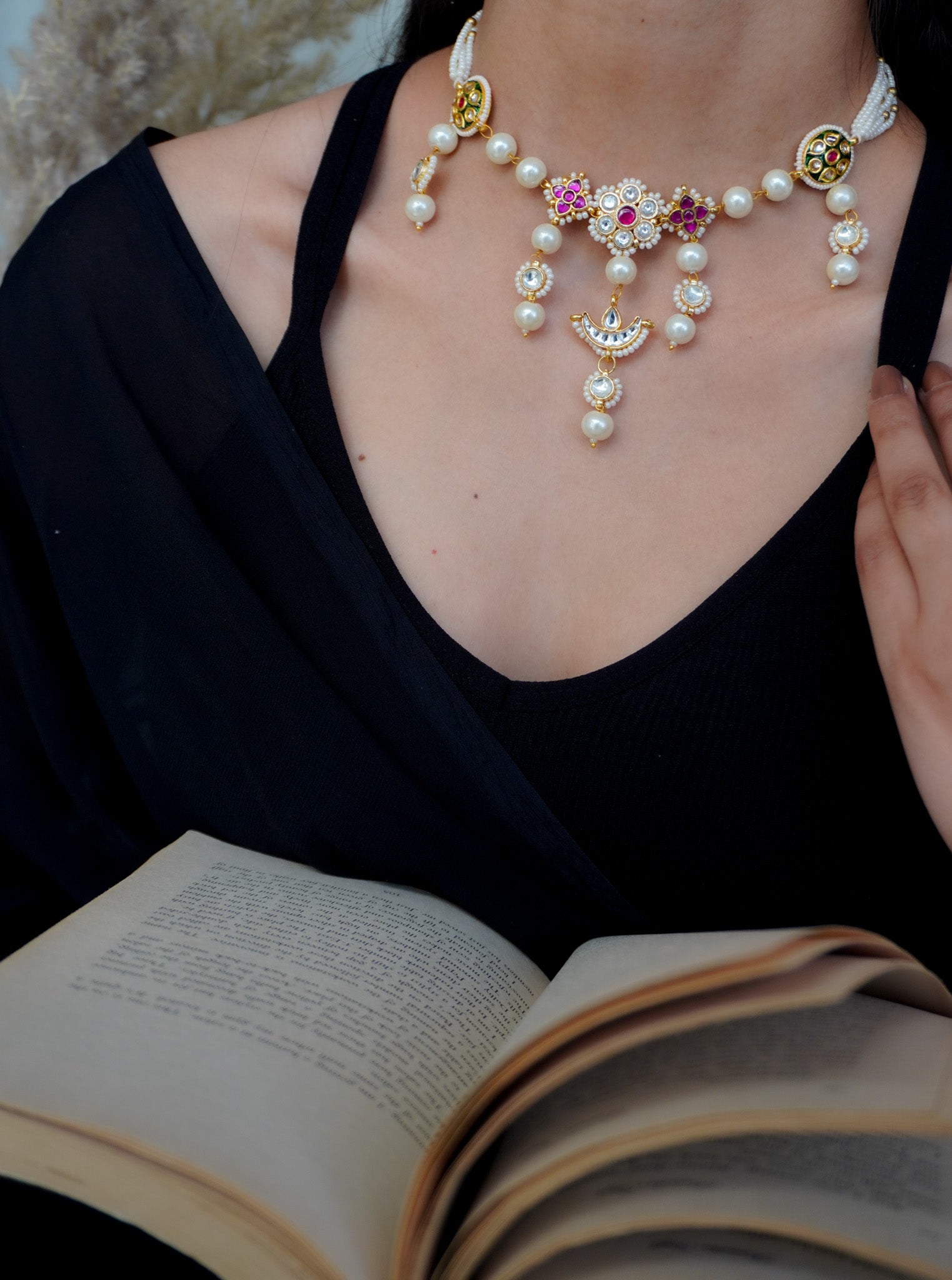 Step into a world of royal elegance with this stunning Kundan and pearls necklace — a true masterpiece of traditional artistry. Handcrafted with intricate Kundan settings and strands of luminous pearls, this necklace blends the richness of heritage with timeless grace. Ideal for brides, festive occasions, or cultural celebrations, it adds a touch of regal charm and classic beauty to any ensemble.